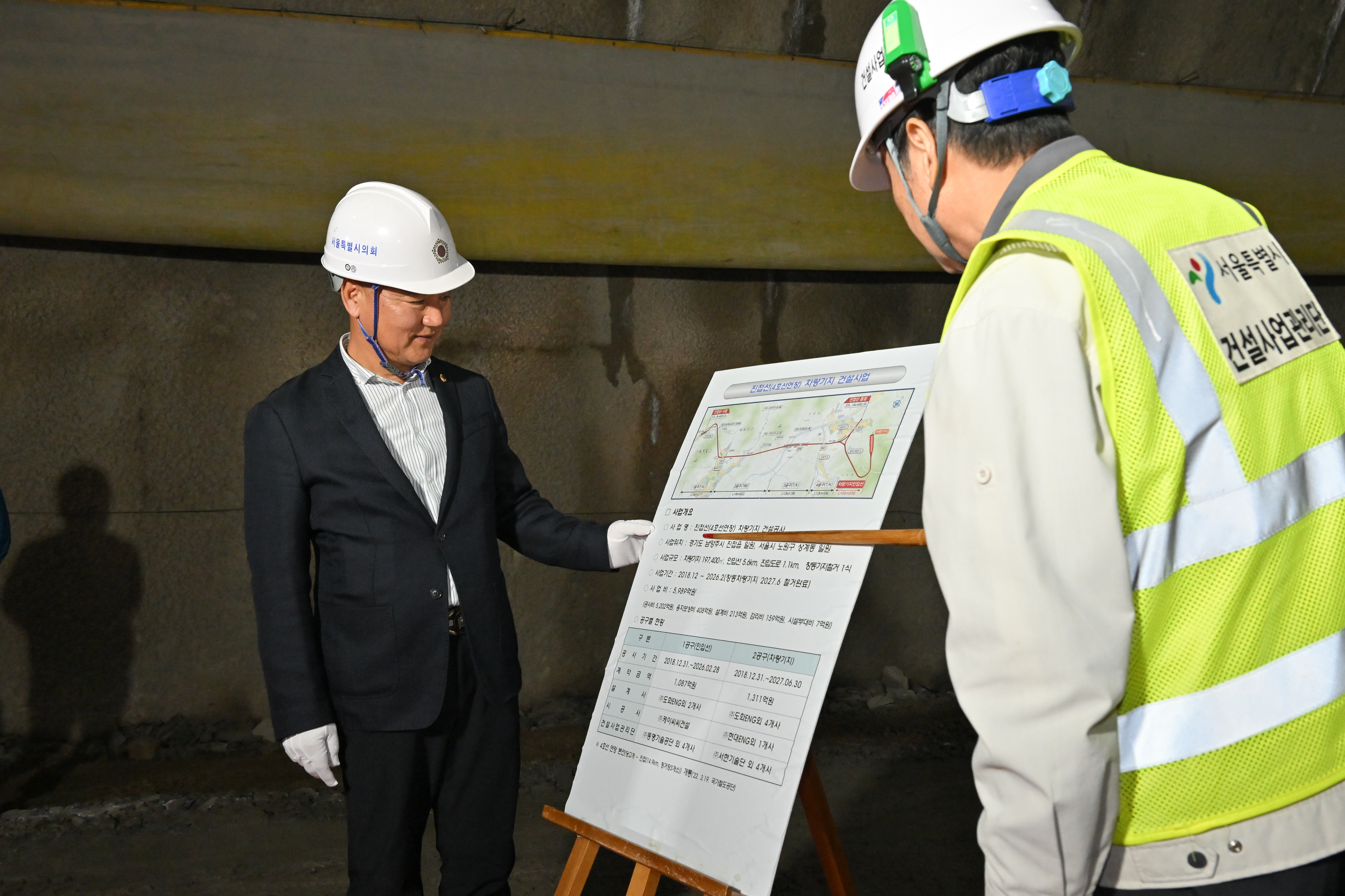 진접차량기지 국내 최초로 산 중턱에 건설되는 차량기지로 건설공사는 총 2개 공구로 나눠 공사를 진행중이며 제1공구는 운행을 마친 열차가 들어오는 입·출고선을 건설하고 제2공구는 열차를 주박하는 유치선과 각종 점검 및 관리를 하는 검수고 등 설치하는 차량기지 건설공사로 구분해 추진 중이며 4월 현재 기준 공정율은 약 42% 수준이다. 이날 현장 방문을 통해 진접차량기지 터널공사 현장을 직접 방문하고 입·출고선 및 차량기지 공사 진행상황과 공사현장 직원들의 안전확보와 중대재해 방지를 위해 추진 중인 현장 중점관리 방안인 CCTV, 비콘(Beacon), 드론 등 스마트 안전기술 적용을 통한 공사현장 안전관리에 대한 세부 설명을 듣는 시간을 가졌다.