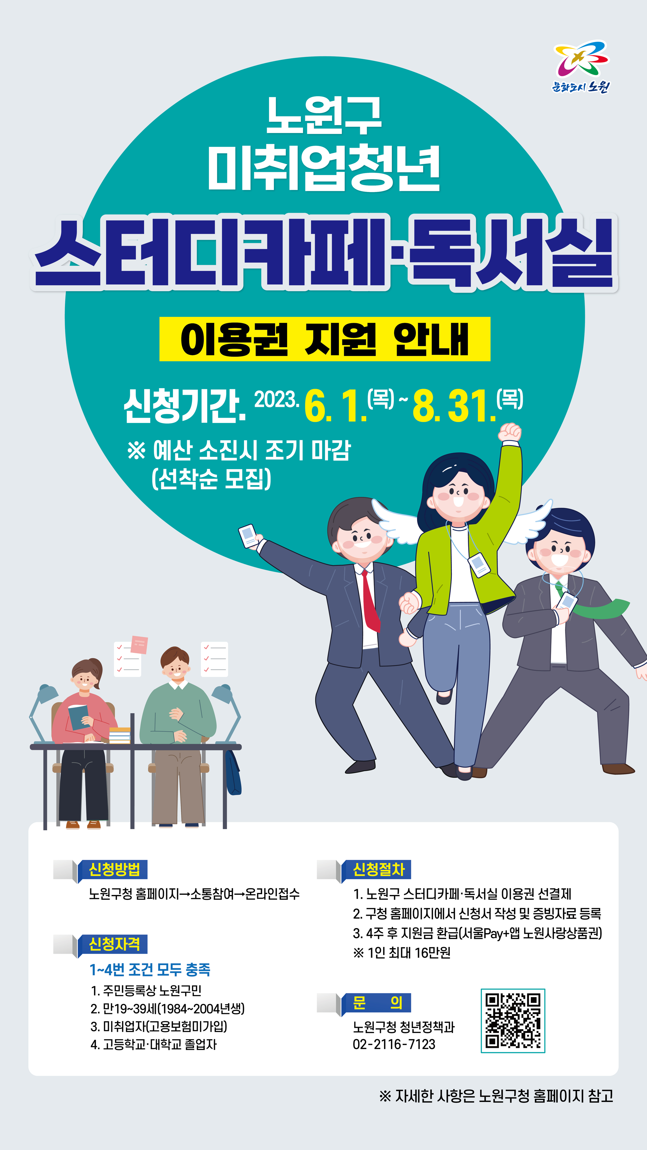 지역 스터디 카페·독서실 이용권을 구매한 뒤 노원구청 홈페이지를 통해 온라인 신청을 하면 본인 명의 휴대전화로 지원금(노원사랑상품권)을 환급해준다. 최대 16만원 지원한다.