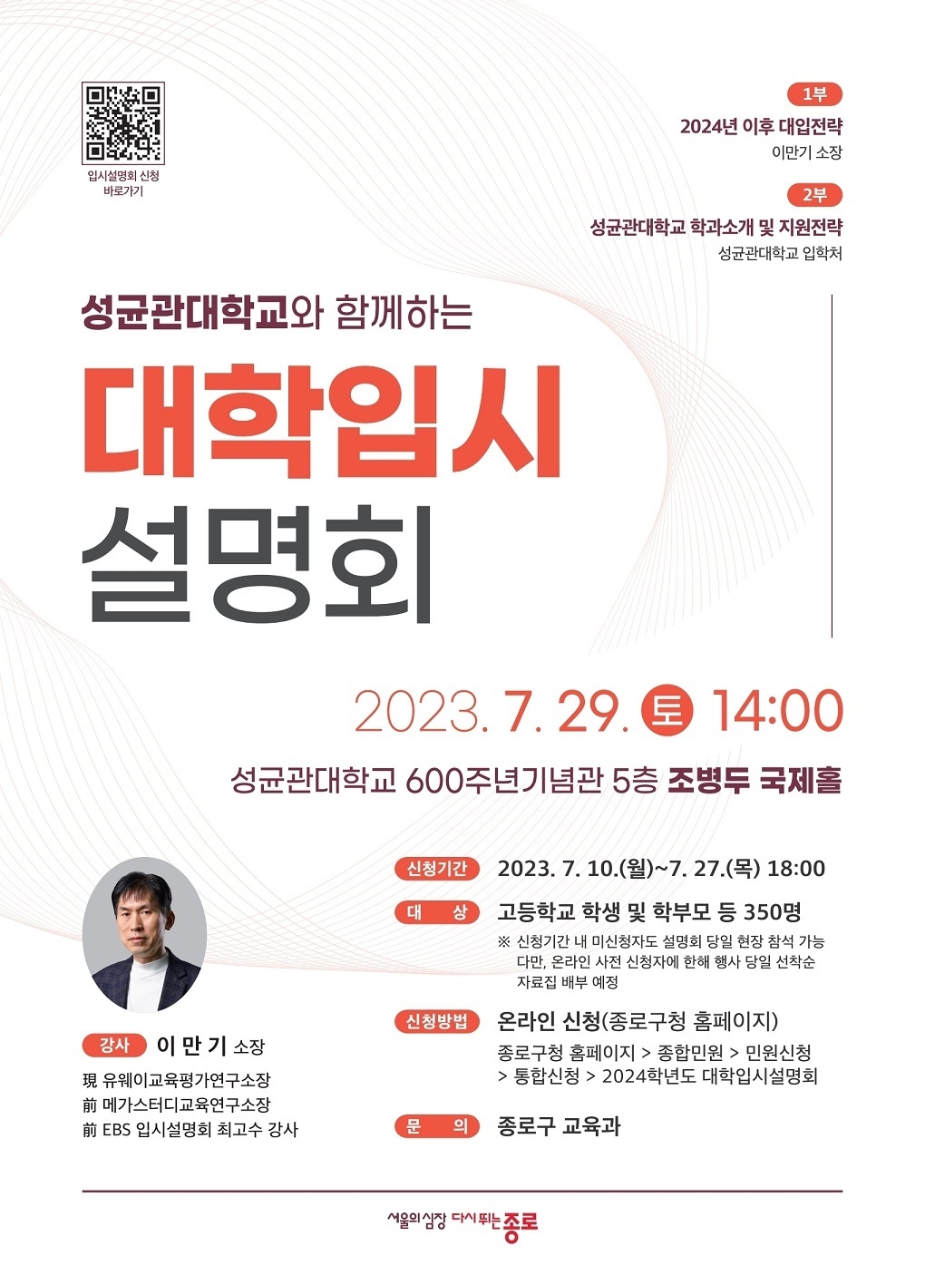 정문헌 종로구청장은 “유명 입시 전문가의 깊이 있는 특강과 함께 성균관대학교의 입학 전략까지 한자리에서 알아볼 좋은 기회가 될 것”이라며 “이번 설명회가 무더운 날씨에 공부하느라 고생 많은 수험생과 자녀 대입 문제를 염려하는 학부모에게 도움이 되길 바란다”고 밝혔다.