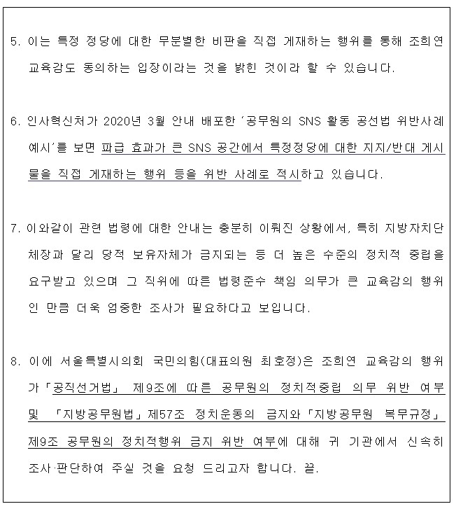 서울시의회 국민의힘(대표의원 최호정)은 조희연 서울시교육감이 본인의 블로그(2023. 7.6)을 통해 ‘공유한다’며 게시한 글이 공무원의 정치적 중립을 규정한 공직선거법과 지방공무원법 위반이라고 밝혔다.서울시선관위와 교육감에 대한 감독권이 있는 교육부에 공개질의서를 보내고, 법령위반 혐의를 파악해 만약 법을 어겼다고 판단될 경우 즉각 엄중한 조치를 취해 줄 것을 28일 요구했다.
