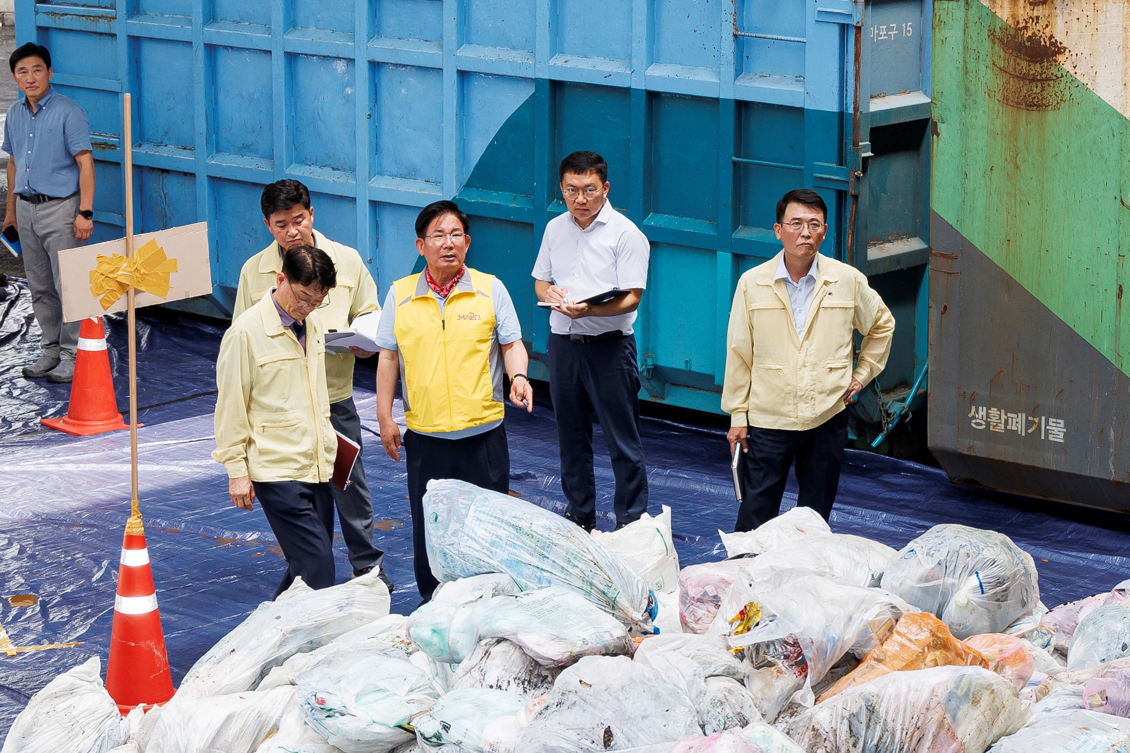 박강수 마포구청장과 도시환경국장, 자원순환과장 등 구 직원 20여명과 환경 공무관 10명은 지난달 31일 마포구 청소차고지에서 5t 용량의 생활폐기물 수거차량 총 4대에 실린 20t의 쓰레기를 조사했다.