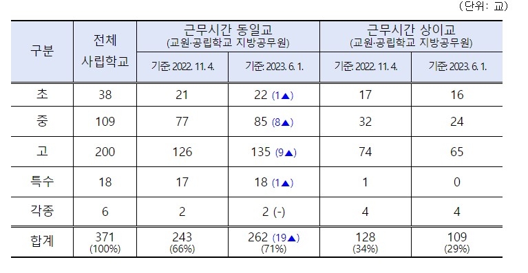 한편, 2023년 들어 사무직원 근무시간을 개선한 사립학교는 아래와 같다.