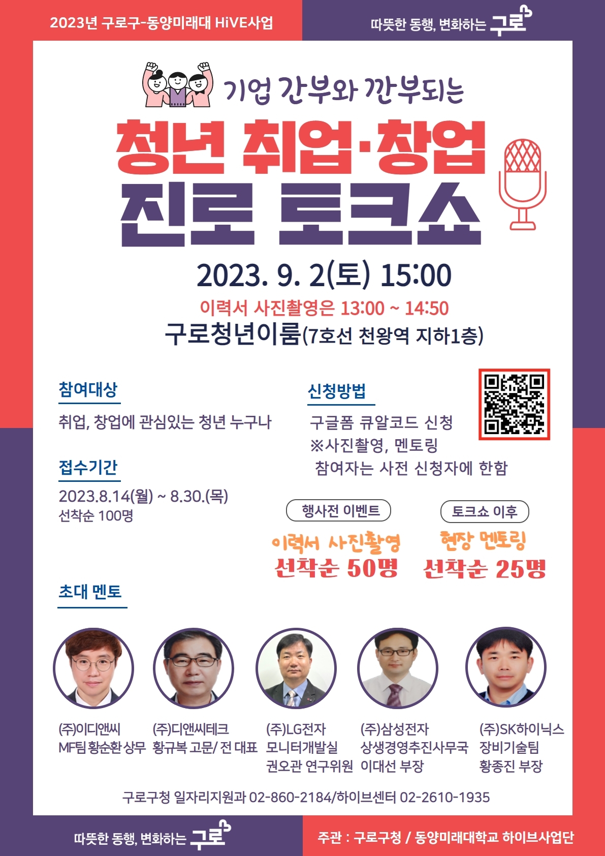 토크쇼는 다음 달 2일 7호선 천왕역사 내에 있는 청년이룸에서 오후 3시부터 열린다. 토크쇼에서는 기업인 멘토들의 경험담과 현실적인 조언을 들을 수 있다. 토크쇼 후에는 사전 신청자를 대상으로 현장 멘토링이 이뤄진다.