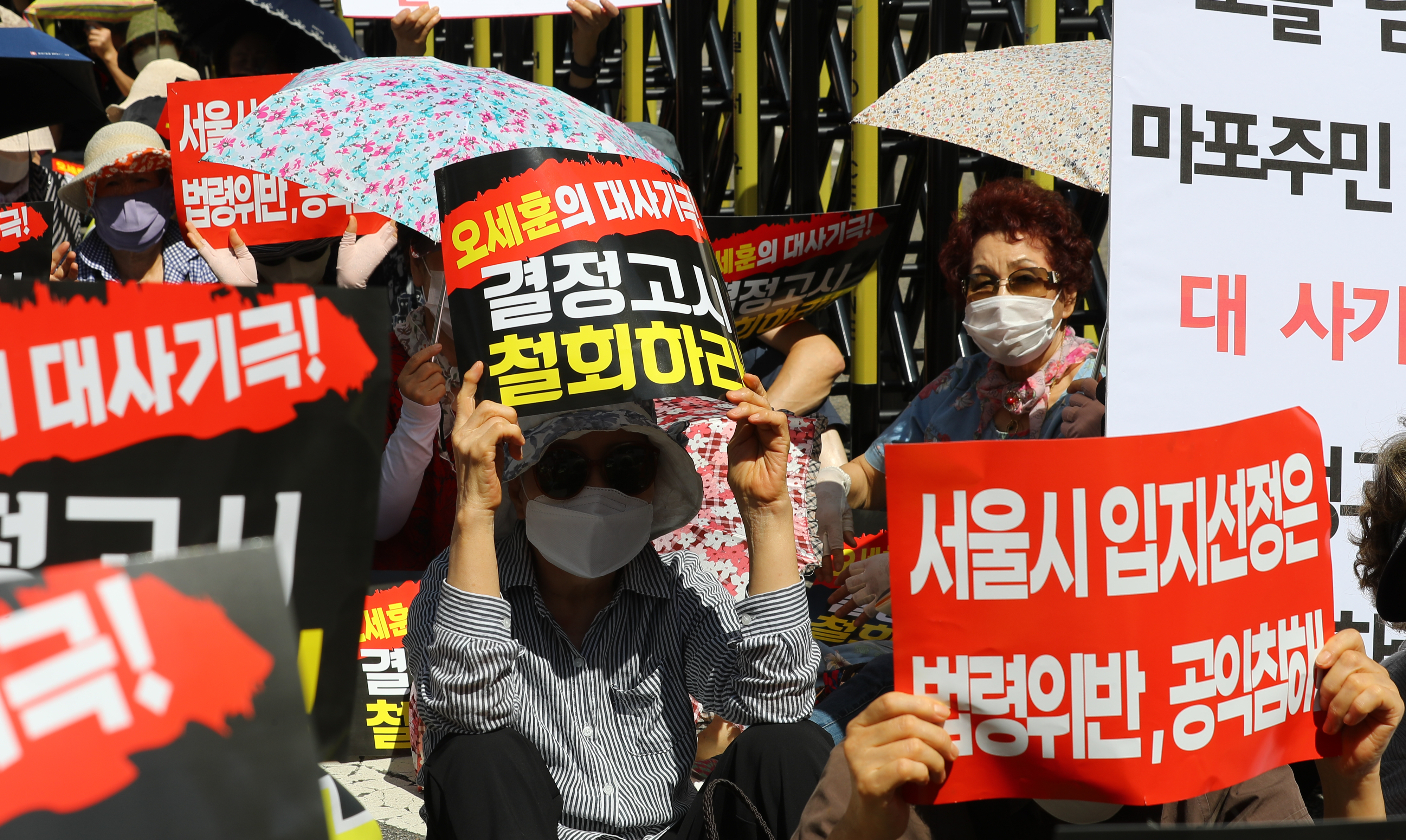 | 마포소각장 결정고시 철회 촉구하는 주민들 7일 서울 중구 서울시청 신청사 인근 도로에서 주민들이 마포소각장 결정고시 철회를 요구 하는 주민집회를 하고 있다. 2023.09.07 뉴시스 |