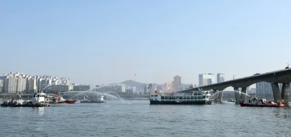 | 24일 오전 서울 여의도 원효대교 인근 해상에서 열린 2024년 한강수난사고 민관합동 대응훈련에서 119수난구조대, 한강경찰대, 해양경찰, 수상업체 등이 화재 진압훈련을 하고 있다. 2024.10.24 뉴스1 |