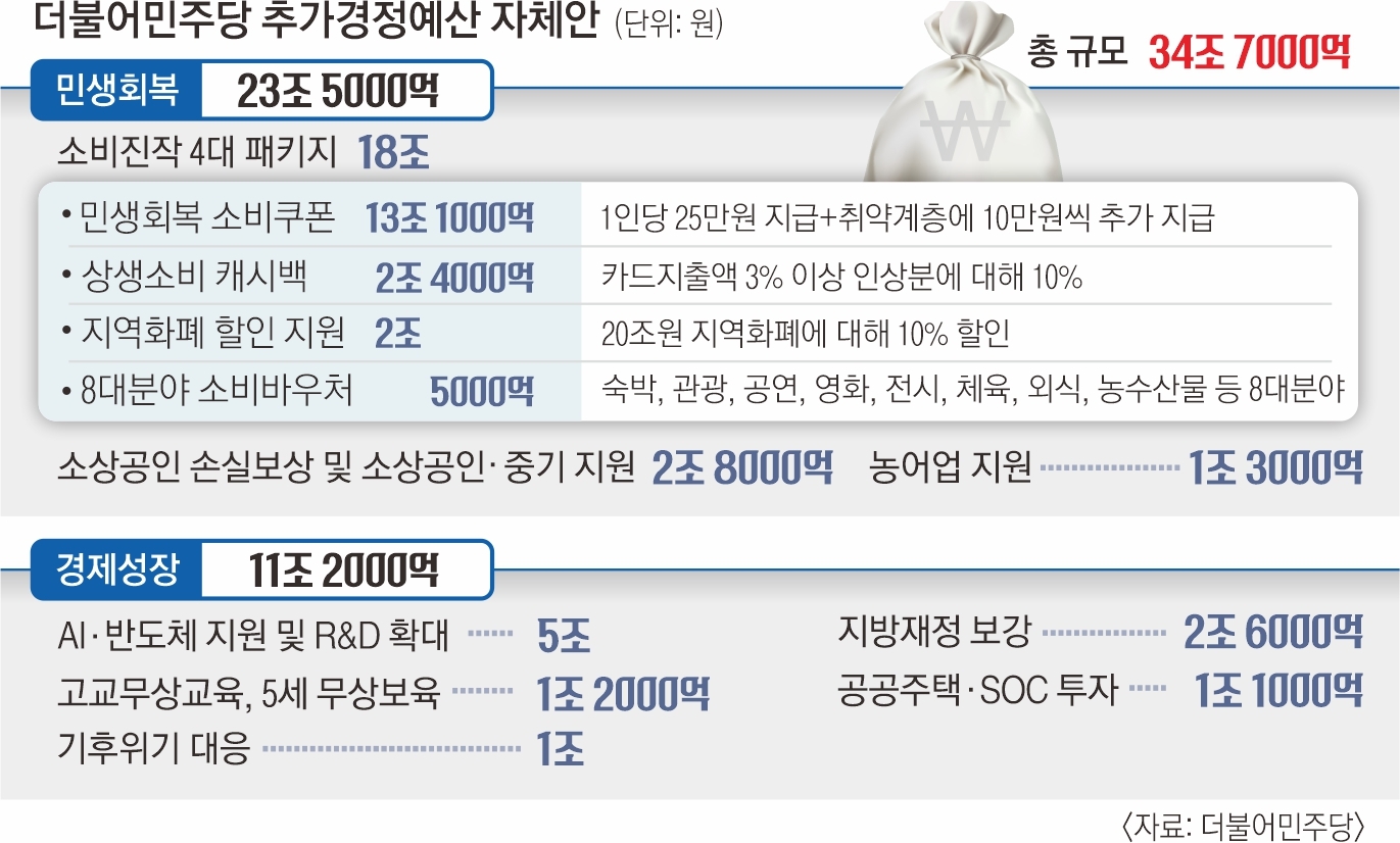 더불어민주당이 35조원 규모의 ‘매머드급’ 추가경정예산(추경) 추진 계획을 밝히며 절반 이상을 민생회복 소비쿠폰 등 소비 진작에 쓰겠다고 했다. 국민의힘은 “거대 야당의 부적절하고 오만한 발상”이라며 자체 추경안 철회를 요구했다.