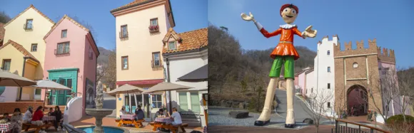 이탈리아 마을은 약 3년 전에 개장했다. 쁘띠프랑스와 인접해 있기는 하지만 별도로 입장해야 한다. 쁘띠프랑스가 프로방스와 어린왕자가 테마라면 이탈리아 마을은 피노키오와 다빈치가 테마다. 짧은 언덕길을 오르면 거대한 피노키오가 여행자의 시선을 압도한다. 마을 안으로 들어서면 유럽의 골목이다. 피노키오에 등장하는 소목장 할아버지의 이름을 따서 제페토 골목이라는 이름을 붙였다. 유리 진열장 상점에서는 무료로 가면과 무도회 의상 체험이 가능하다. 기념사진을 찍기에 더없이 좋은 곳이다. 언덕을 모두 오르면 넓은 광장이 나타난다. 좌측에는 피노키오 모험관이 있고 우측에는 다빈치 전시관이 있다. 피노키오 모험관에서는 다양한 캐릭터의 피노키오를 만날 수 있고, 다빈치 전시관에서는 천재적인 예술가이자 과학자, 발명가였던 레오나르도 다빈치의 작품들을 감상할 수 있다.