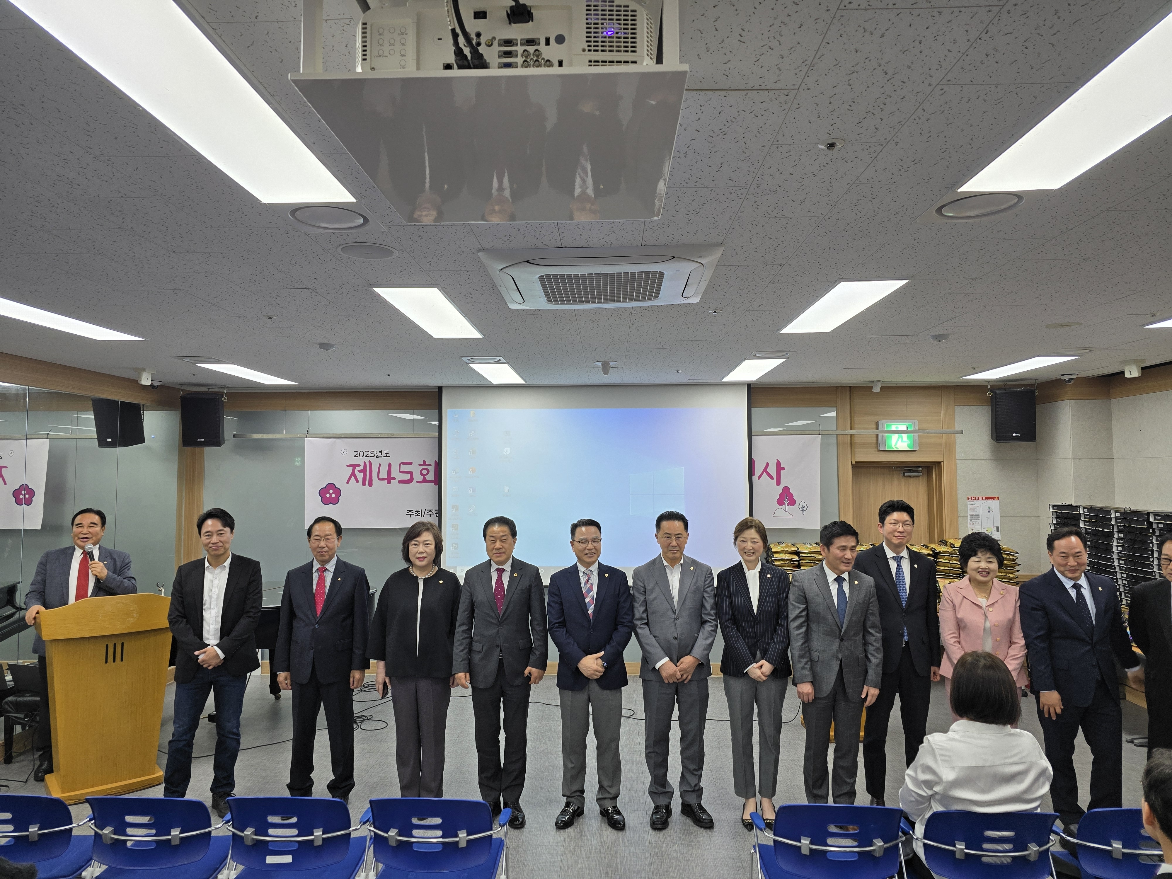 | 지난 18일 용산구장애인커뮤니티센터 강당에서 개최된 ‘2025년도 제45회 장애인의 날 기념 나눔 행사’에 참석한 김용호 의원(왼쪽 다섯 번째)이 참석한 내빈과 함께 회원들에게 인사를 하기 위해 서 있다. |