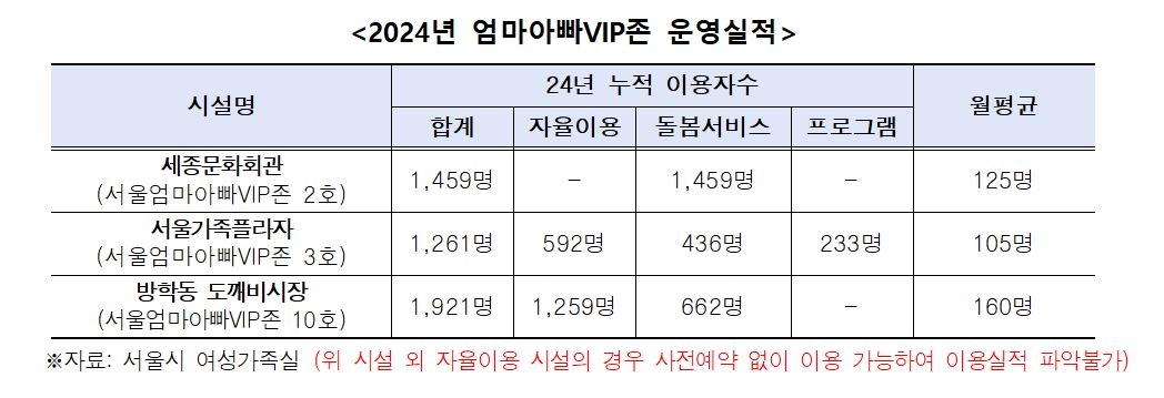 여성가족실 자료에 따르면 ▲2억원 이상 투입된 ‘서울가족플라자 VIP존’의 월평균 이용인원은 105명(하루평균 5명) ▲2억 4000만원을 투입한 ‘방학동 도깨비시장 VIP존’은 월평균 160명(하루평균 8명) ▲7200만원이 투입된 ‘세종문화회관 VIP존’은 월평균 125명(하루평균 6명)으로 나타났다.
