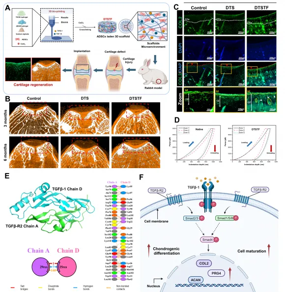 연구팀은 탈세포화된 돼지 해면골 유래 세포외기질(dECM)에 셀룰로오스 나노섬유(TOCN)와 알지네이트를 조합한 생체활성 단백질 기반 바이오잉크에, 성장인자(TGF-β1, FGF-18)와 지방유래 줄기세포(ADSCs)를 탑재한 3D 바이오프린팅 연골 치료소재를 개발했다.