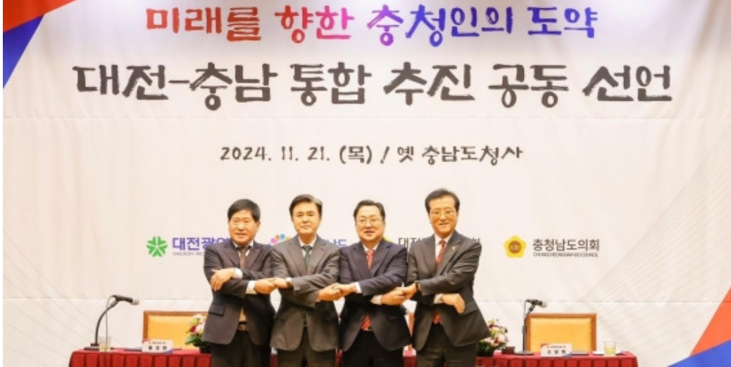 | 홍성현(왼쪽부터) 충남도의회 의장과 김태흠 충남지사, 이장우 대전시장, 조원휘 대전시의회 의장이 지난해 11월 21일 ‘대전·충남 행정통합 추진 공동선언’을 진행한 뒤 기념사진을 찍고 있다. 서울신문DB |