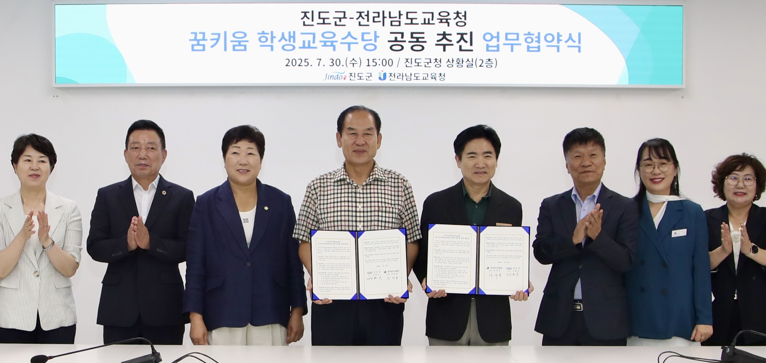 전남교육청이 초등학생을 대상으로 운영 중인 학생교육수당을 기초지자체와 협력해 중·고등학생까지 확대한 첫 사례다. 전국 최초로 추진해 온 교육복지 정책이 한 단계 더 도약하는 계기가 될 것으로 기대된다. 이번 협약에 따라 2026년 3월부터 진도군에 거주하는 모든 초·중·고등학생에게 월 10만원의 전남학생교육수당이 지급될 예정이다. 중·고등학생에게 지급되는 전남학생교육수당 재원은 전남교육청과 진도군이 공동으로 분담해 추진한다.