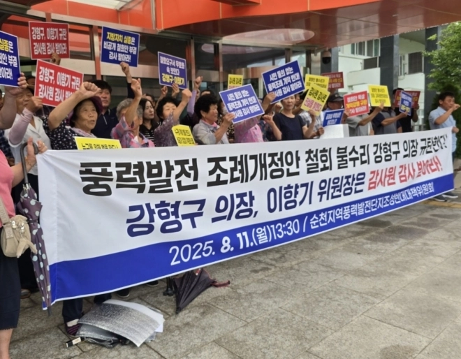 이와관련 순천지역 풍력발전단지조성 반대대책위원회는 지난 11일 순천시청 앞에서 집회를 열고 “지난달 7일 김영진 시의원이 제출한 ‘풍력발전 민가 이격거리 완화 조례안(순천시 도시계획조례 일부개정조례안 철회동의의 건)’을 의장이 즉시 수리하지 않고, 23일 도시건설위원회에 회부했다”며 “순천시의회가 계류 중인 ‘풍력발전 조례 개정안’에 대한 철회 요구서 불수리는 절차를 무시한 결정으로 무효다”고 강력 반발하고 나섰다. 이어 “도시건설위원회는 비공개 축조심사로 ‘철회안 부동의 의결’을 강행했다”며 “이는 회의규칙을 정면으로 위배한 것으로 정식 의제화 절차 없이 비공개로 진행된 부결은 발의자의 입법권과 시민의 알권리를 침해한 행위다”고 주장했다.