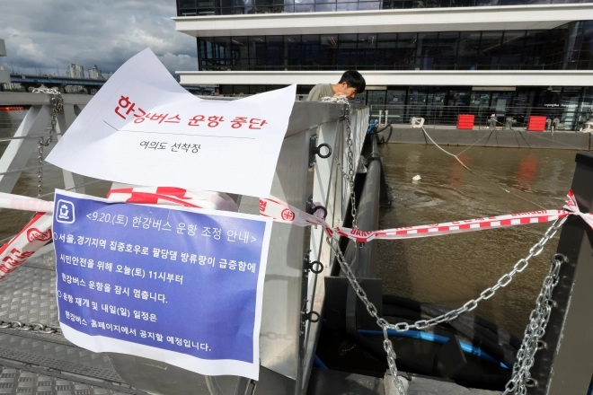 서울시는 서울·경기 지역 집중호우로 인한 팔당댐 방류 증가로 20일 한강버스 운항을 임시 중단한다고 밝혔다.