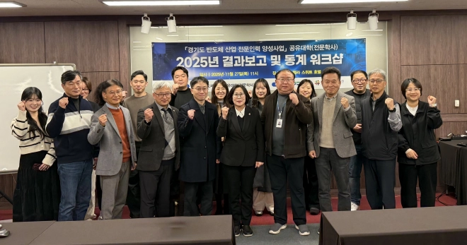 | 27일 벨라스위트 호텔 수원에서 열린 ‘경기도 반도체 산업 전문인력 양성사업, 공유대학 2025년 결과보고 및 동계워크숍’에서 특별강연자로 참석한 서현옥 의원이 참석자들과 기념촬영을 하고 있다.(사진=경기도의회) |