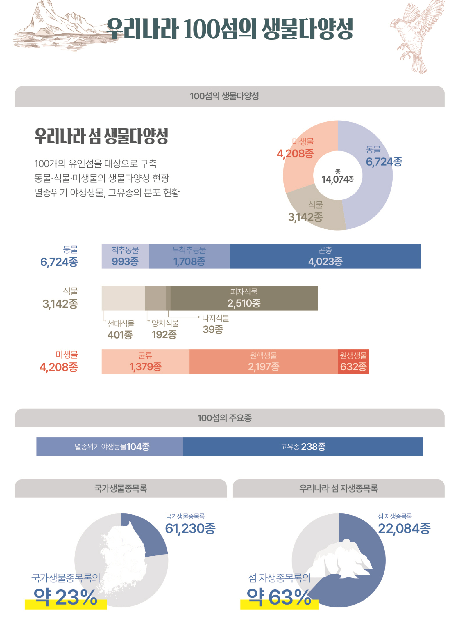 이는 국가생물종목록 6만 1230종의 약 23%를 차지하며, 우리나라 섬 자생종 목록 2만 2084종의 약 63%에 해당한다.
