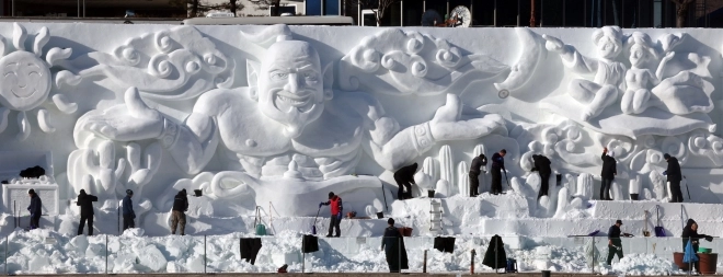 화천산천어축제 개막을 나흘 앞둔 6일 축제장인 강원 화천군 화천천 주변에서 대형 눈 조각 작품 제작이 한창 이뤄지고 있다.
