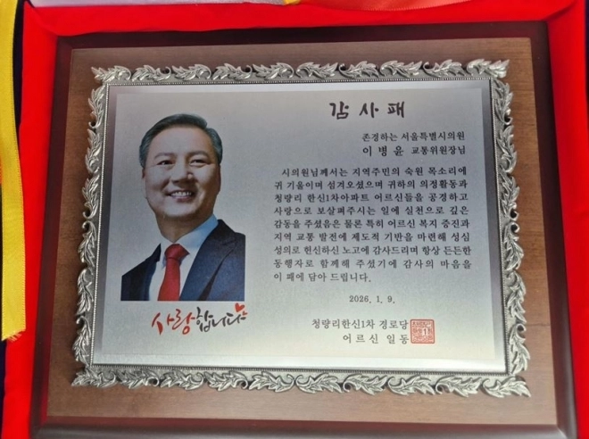 이병윤 서울시의회 교통위원장(국민의힘, 동대문구1)은 지난 9일 청량리한신1차아파트 경로당에서 지역 어르신 복지 증진과 교통발전에 기여한 공로를 인정받아 감사패를 수여 받았다.