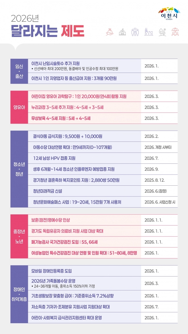 경기 이천시가 2026년 새해를 맞아 시민 생활과 밀접한 달라지는 제도를 담은 ‘2026년 달라지는 제도’ 책자를 발간했다.