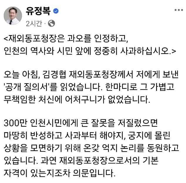 유정복 인천시장이 김경협 재외동포청장을 향해 “인천의 역사와 시민 앞에 정중히 사과하라”고 요구했다. 동포청 이전 논란을 둘러싸고 양측의 갈등이 깊어지는 모양새다.