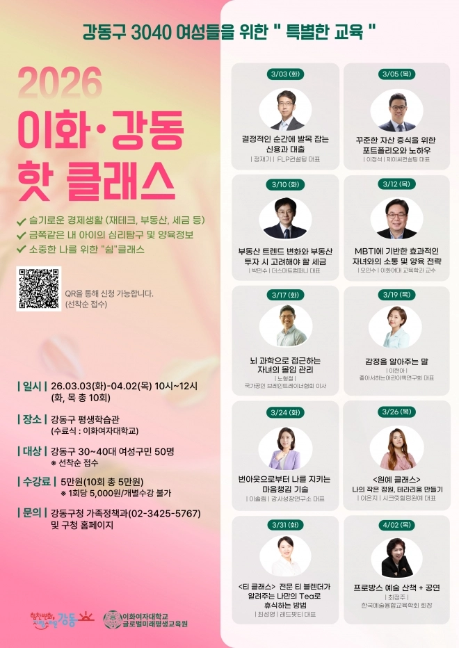 이수희 강동구청장은 “이화-강동 핫 클래스는 3040 젊은 여성들이 가정을 돌보면서도 자기계발을 멈추지 않고 지속적으로 재테크 등을 통해 경제·사회활동의 역량을 키울 수 있도록 지원하는 교육 프로그램”이라며 “이번 교육을 통해 우리구 3040 여성분들이 새로운 자신감을 얻고 삶의 활력을 채우시기를 희망하며 이 시간이 단순한 배움을 넘어 삶에 실질적인 변화를 일으키는 소중한 계기가 되기를 진심으로 응원한다“고 말했다.