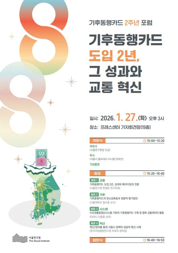 오균 서울연구원장은 “기후·교통·도시정책을 통합적으로 연구하고, 기후동행카드가 지속 가능한 도시정책의 모범 사례로 더욱 발전할 수 있도록 정책적 해법을 제시해 나가겠다”고 말했다.