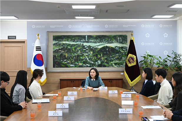 서울특별시의회 최호정 의장(국민의힘·서초4)은 지난 26일 ‘제8기 겨울방학 대학생 인턴 간담회’를 개최하고 청년들과 서울시 정책 현안, 일·가정 양립 고민 등을 주제로 진솔한 대화를 나눴다. 이번 간담회에는 대학생 인턴 7명이 참가했으며, 각자가 수행 중인 정책 연구 주제와 활동 소감을 공유했다.