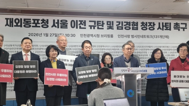 인천지역 131개 시민사회단체로 구성된 인천사랑범시민네트워크는 27일 인천시청에서 기자회견을 열고 “김 청장의 ‘동포청 서울 이전’ 발언은 정부와 외교부가 인천을 동포청 소재지로 결정한 절차적 정당성을 무시한 망언이자 월권”이라고 비난했다.