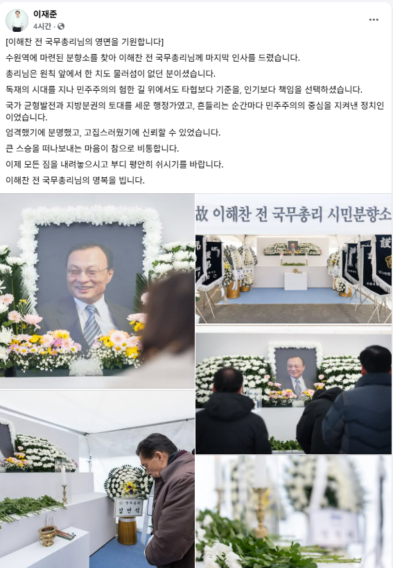 그는 “수원역에 마련된 분향소를 찾아 이 전 총리님께 마지막 인사를 드렸다”며 “총리님은 원칙 앞에서 한 치도 물러섬이 없던 분이셨고 독재의 시대를 지나 민주주의의 험한 길 위에서도 타협보다 기준을, 인기보다 책임을 선택하셨다.”고 평가했다.
