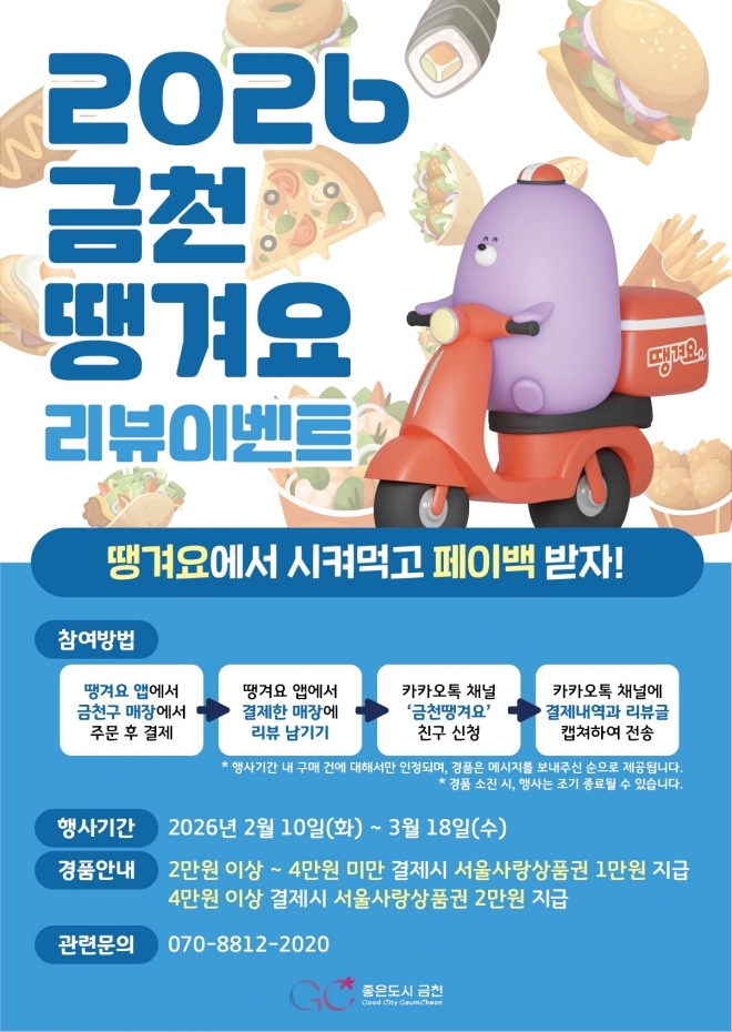금천구는 상품권 이용을 활성화하기 위해 다음달 10일부터 3월 18일까지 리뷰 이벤트도 진행한다. 땡겨요 앱으로 음식 주문 후 리뷰를 작성한 이용자가 대상이다. 2만원 이상 결제 시 서울사랑상품권 1만원, 4만원 이상 결제 시 2만원을 돌려주는 방식이다. 이벤트는 예산 소진 시까지다.