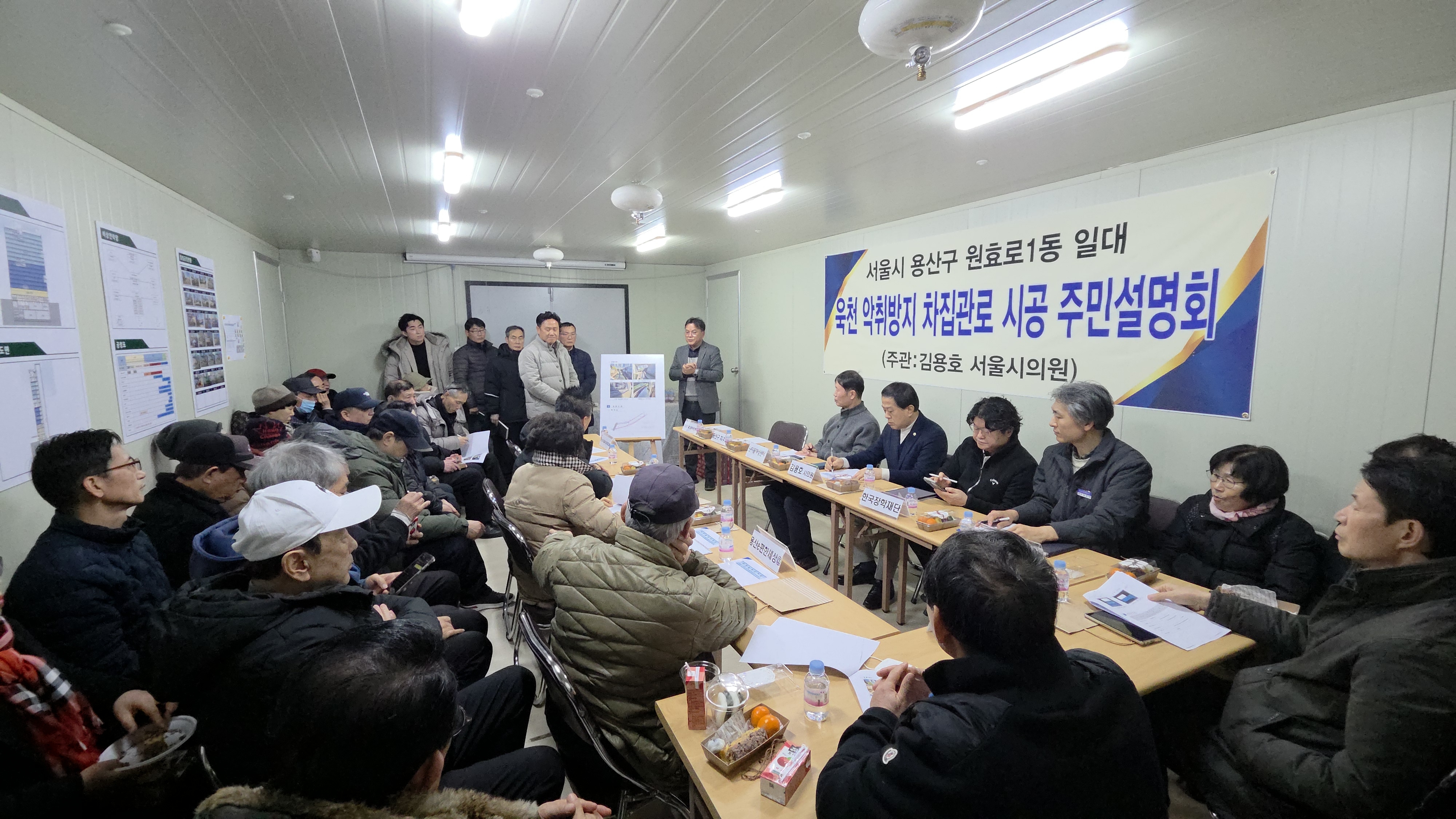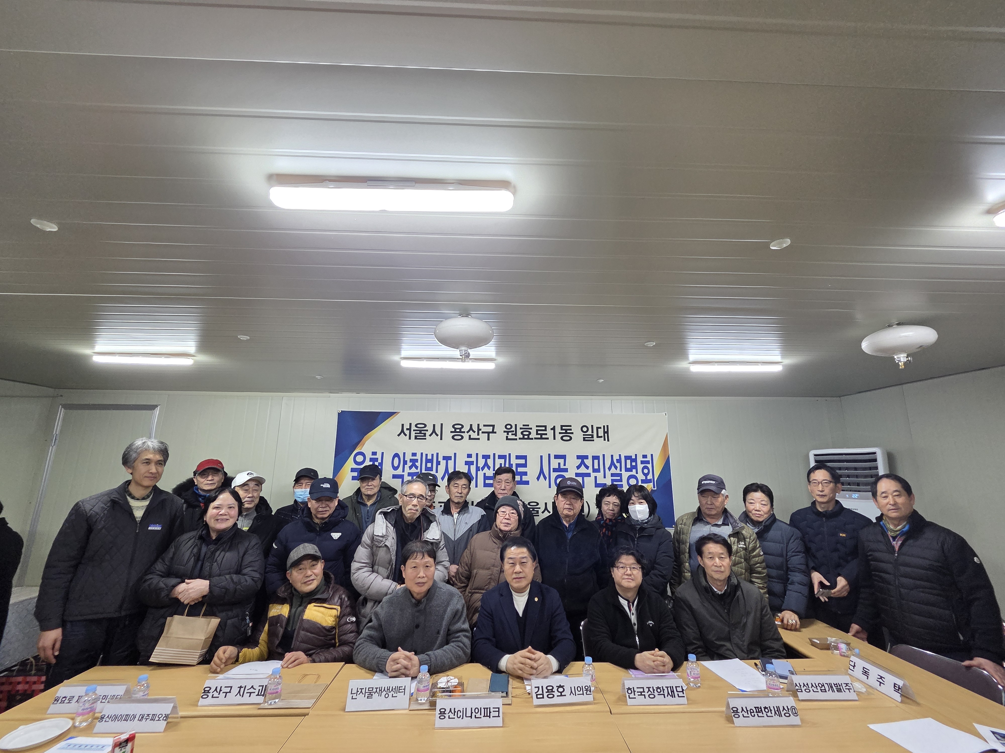 서울시의회 도시안전건설위원회 부위원장으로 활동하고 있는 김용호 시의원(국민의힘, 용산1)은 지난 29일 원효로1동 소재 장학재단 현장사무실에서 열린 ‘욱천 악취 민원 해결을 위한 주민설명회’에 참석해 사업 추진 내용과 향후 공사 계획을 주민들과 공유했다.