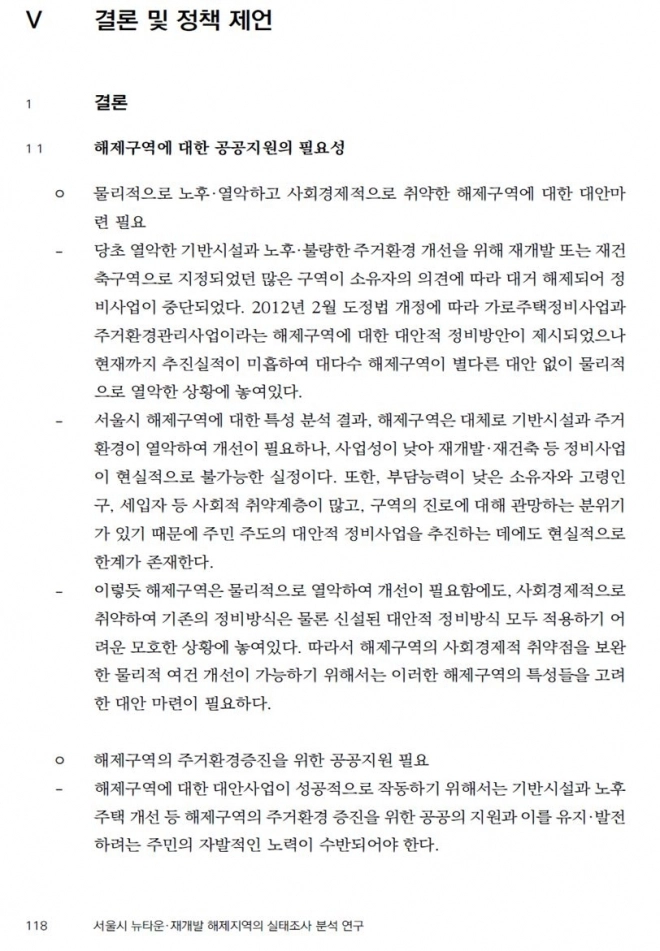 실제 서울시가 직접 그 원인을 직접 분석한 것으로 파악됐다. 당시 서울시 산하 서울연구원에서 발간한 ‘서울시 뉴타운 재개발 해제지역의 실태조사 분석연구’에 따르면 “해제구역은 사업성이 낮아 재개발 재건축 등 정비사업이 현실적으로 불가능한 실정이다. 또한 부담능력이 낮은 소유자와 고령인구, 세입자 등 사회적 취약계층이 많고, 관망하는 분위기가 있기 때문에 주민 주도의 대안적 정비사업을 추진하는 데에도 현실적으로 한계가 존재한다”고 제언한다.