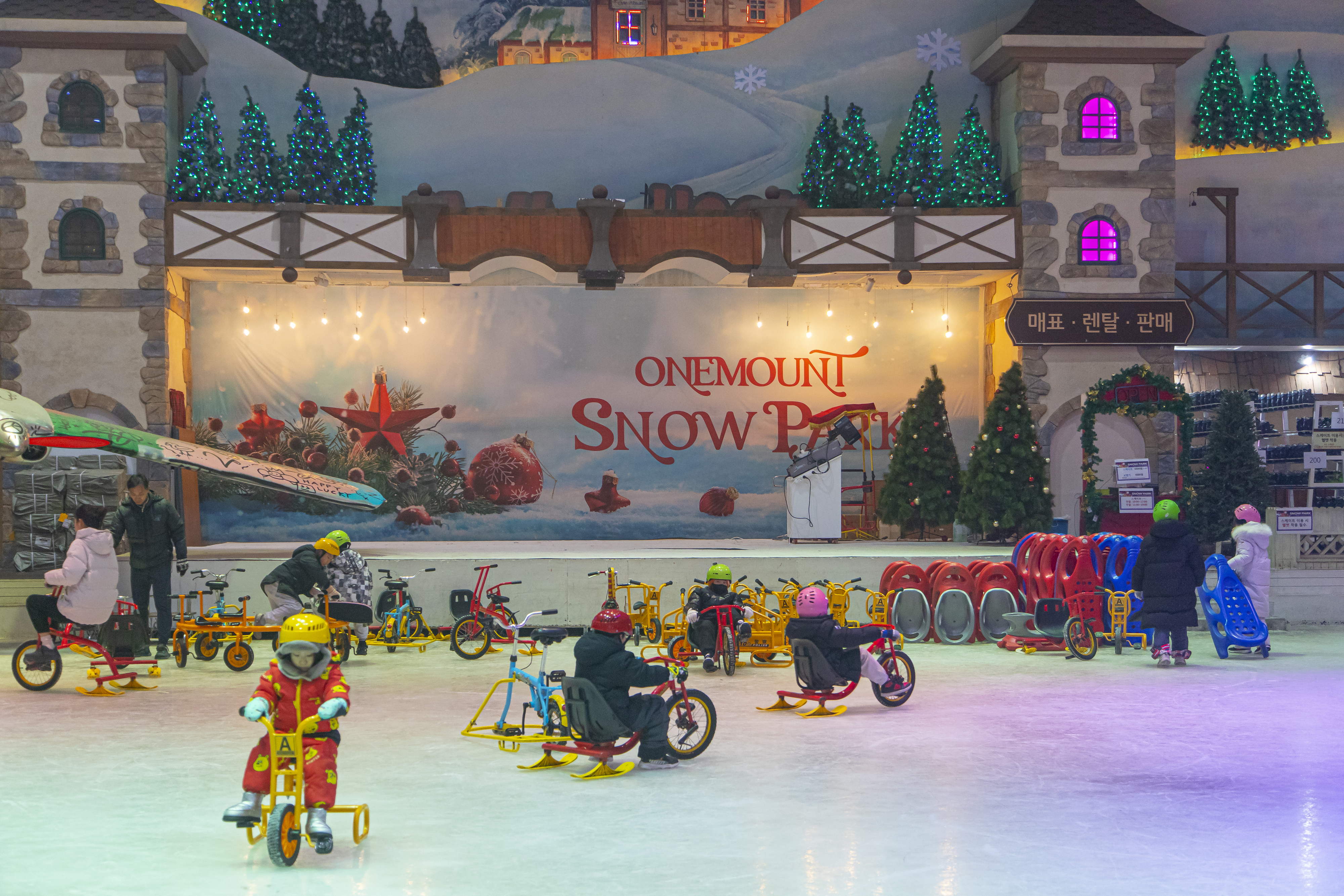 메인 무대는 아이스레이크다. 썰매와 스케이트를 즐길 수 있는 중심 공간으로 맞은편에 무대가 마련되어 있어서 간혹 공연 행사가 진행되기도 한다. 아이스레이크 위에는 산타마을이 마련되어 있다. 핀란드의 산타마을을 모티브로 조성되어 곳곳에 산타 조형물과 화려한 조명들 덕분에 기념사진을 찍기에 좋다. 이 밖에도 어린이들을 위한 미니 눈썰매장과 회전목마가 마련되어 있다. 실내 공간이라 아이들과 함께 움직이기 편하고 겨울 놀이를 처음 접하는 어린이도 부담 없이 즐길 수 있다. 아이들을 동반한 가족 여행자들에게는 안성맞춤이다.