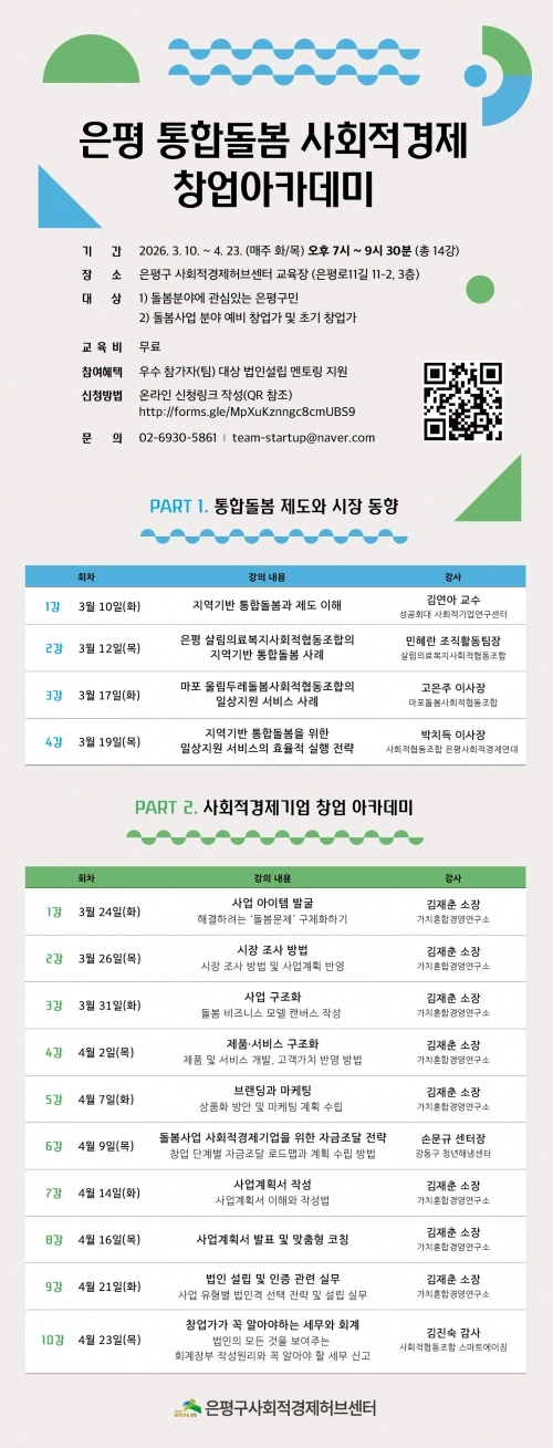 교육은 다음 달 10일부터 4월 23일까지 매주 화·목요일 은평구 사회적경제허브센터에서 총 14회 진행된다. 모집 대상은 돌봄 분야 사회적경제기업 창업을 희망하는 주민과 은평구 기업 중 창업 3년 이내의 초기 창업가다.