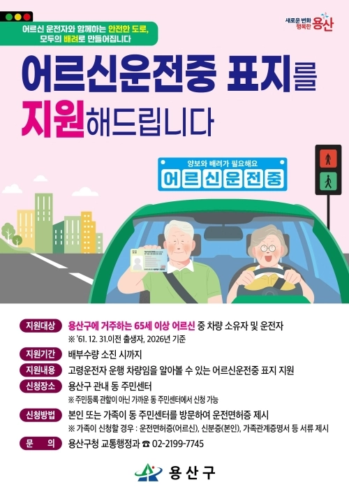 서울 용산구는 고령운전자 안전을 위한 ‘어르신 운전 중’ 표지 배부 사업을 추진한다고 11일 밝혔다.용산구 관계자는 “지난해 첫 시행에 이어 2년 연속 진행하는 사업으로, 고령 운전자를 배려하는 안전한 교통 환경을 만들어간다”고 설명했다. ‘어르신 운전 중’ 표지는 65세 이상 운전자를 대상으로 무료로 제공된다. 운전면허증을 지참해 가까운 동주민센터를 방문하면 신청할 수 있다.
