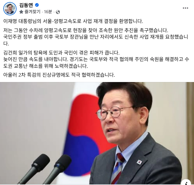 김동연 경기도지사가 “이재명 대통령님의 서울-양평고속도로 사업 재개 결정을 환영한다”고 밝혔다.