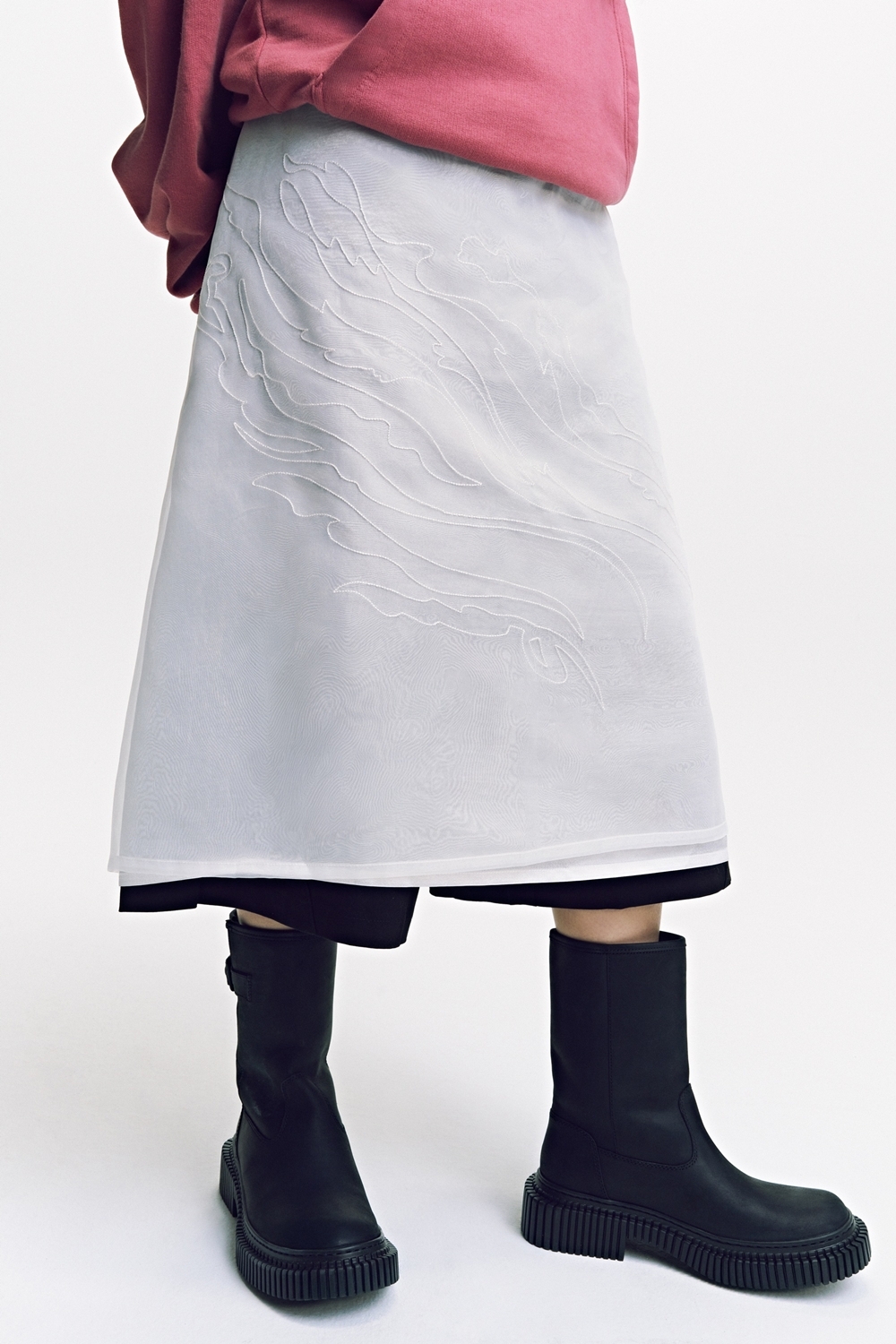 | BTS의 소속사 빅히트뮤직은 국립박물관문화재단과 함께 ‘2026 방탄소년단×뮷즈 컬래버레이션’ 5종을 선보인다. 협업 굿즈는 레이어드 스커트(사진), 숄더백, 카드홀더, 헤어핀과 헤어클립 등 5종이다. 하이브 제공 |