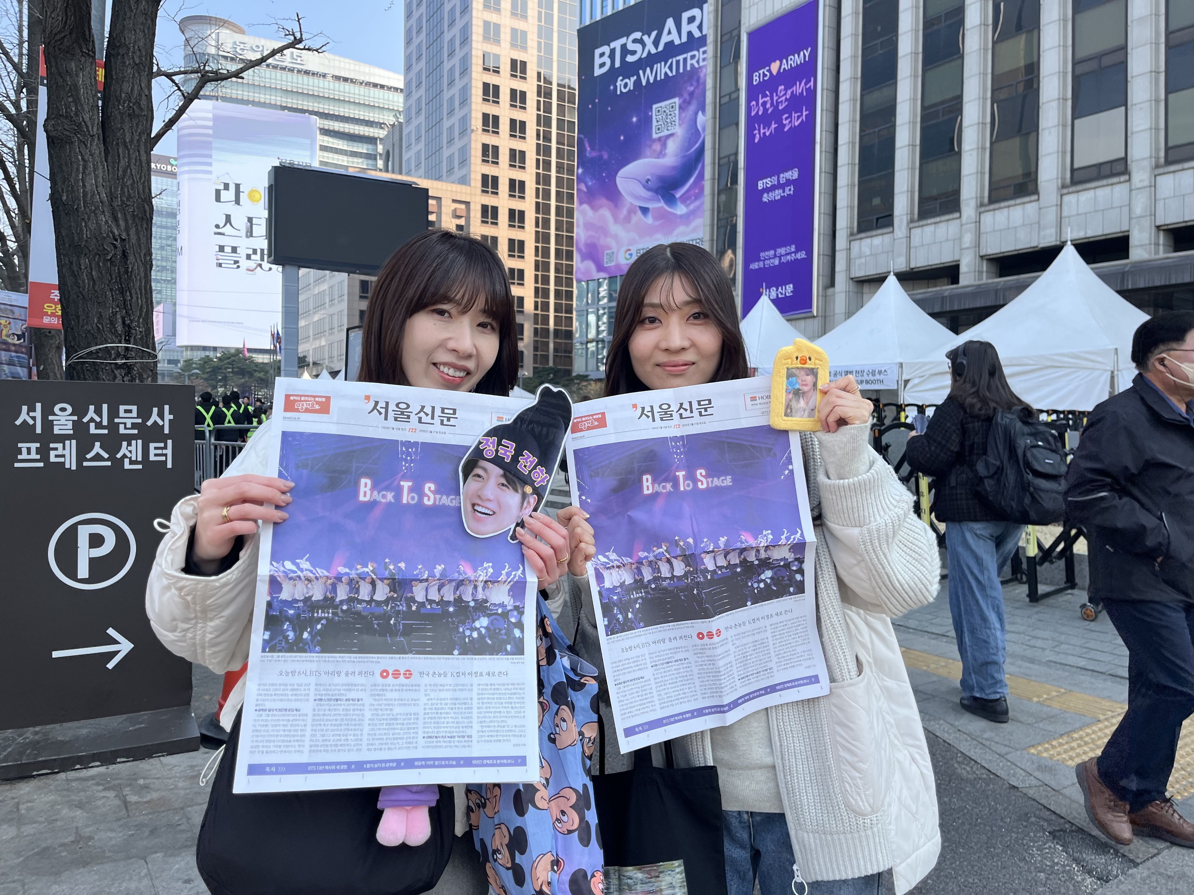 | 일본인 다카나 아유미(왼쪽)와 니시노 마나미가 21일 서울 중구 프레스센터 앞에서 서울신문 BTS 특별판을 들고 기쁘게 웃고 있다. 표지엔 BTS의 상징색인 보랏빛이 강조된 공연 장면이 담겨 이른바 ‘굿즈’를 모으려는 팬들 사이 인기였다. 박다운 수습기자 |