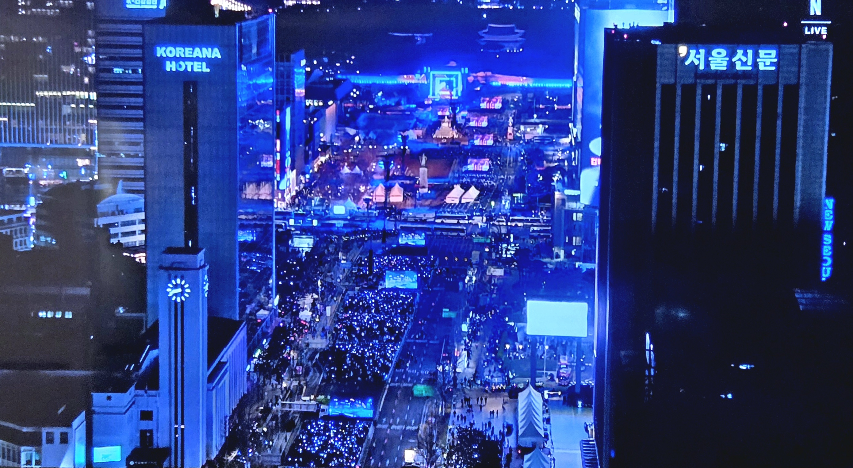 | BTS와 함께… 전 세계에 각인된 광화문 세종대로 K팝 그룹 방탄소년단(BTS)이 지난 21일 서울 광화문광장에서 3년 9개월 만에 완전체로 돌아온 것을 알리는 컴백 공연 ‘BTS 컴백 더 라이브: 아리랑’을 펼치는 가운데, 서울신문이 있는 한국프레스센터 앞으로 아미들의 보랏빛 물결이 넘실대고 있다. 이날 공연은 넷플릭스를 통해 전 세계 190여개국에 생중계됐다. 넷플릭스 캡처 |