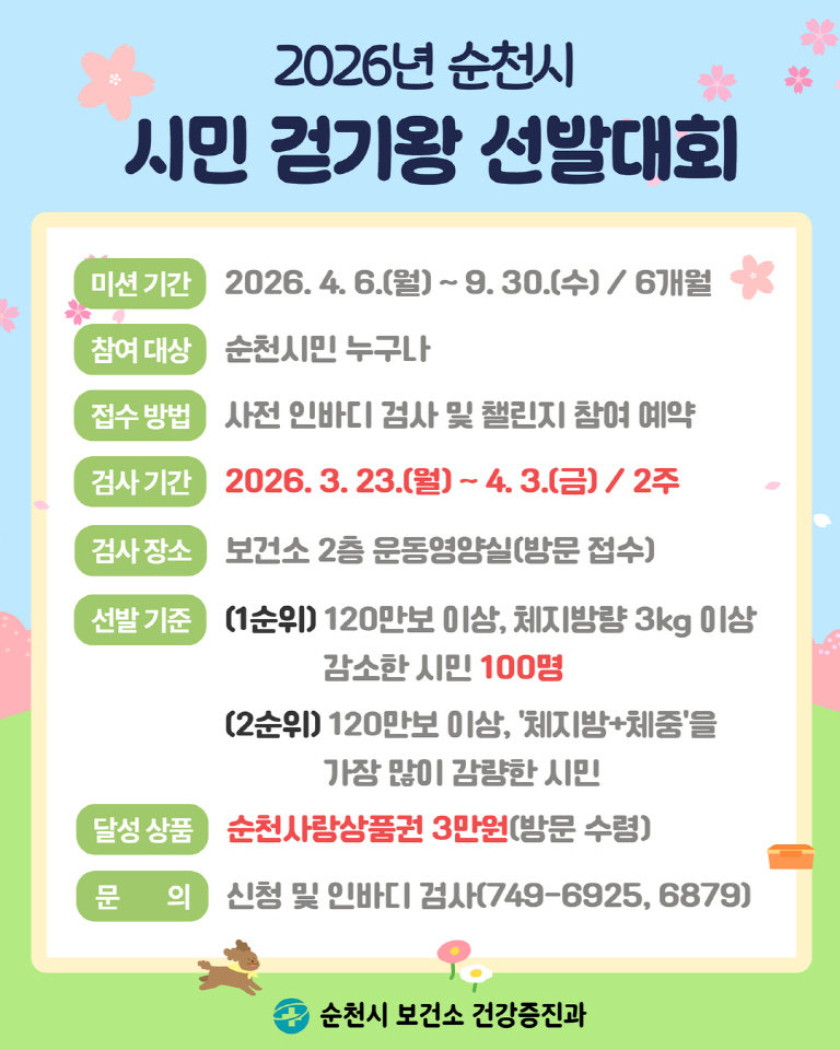 순천시가 시민들의 일상 속 걷기 실천을 유도하고 건강생활 습관 형성을 위해 ‘2026년 시민 걷기왕 선발대회’를 운영한다.