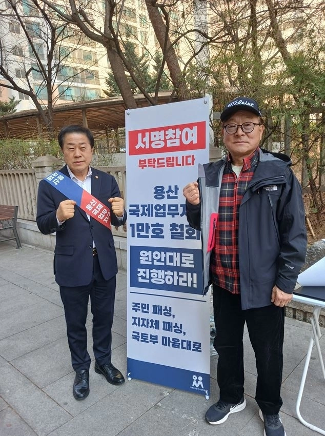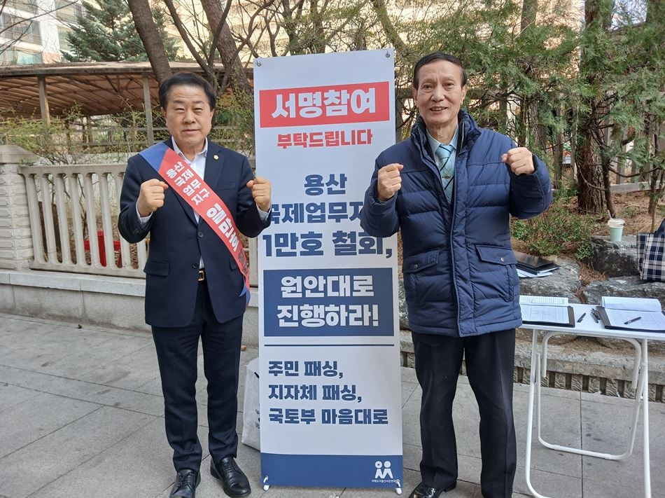 서울시의회 도시안전건설위원회 부위원장으로 활동하고 있는 김용호 의원(국민의힘, 용산1)은 지난 22일 용산역과 이촌역 일대에서 진행된 ‘용산국제업무지구 1만 호 주택 건립 반대 주민 2차 주민 서명운동’ 현장을 찾아 시민 의견을 청취했다.