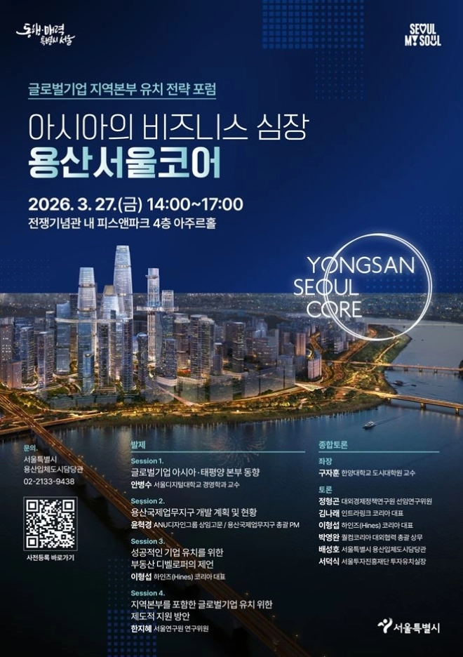 한편 서울시에서는 오는 27일 오후 2시부터 5시까지 전쟁기념관 피스앤파크에서 ‘아시아의 비즈니스 심장인 용산국제업무지구(용산서울코어) 내 글로벌 기업 지역본부 유치 전략 포럼’을 개최할 예정이다. 시는 전문가 그룹이 참여하는 종합 토론을 진행할 계획이라고 밝혔다.