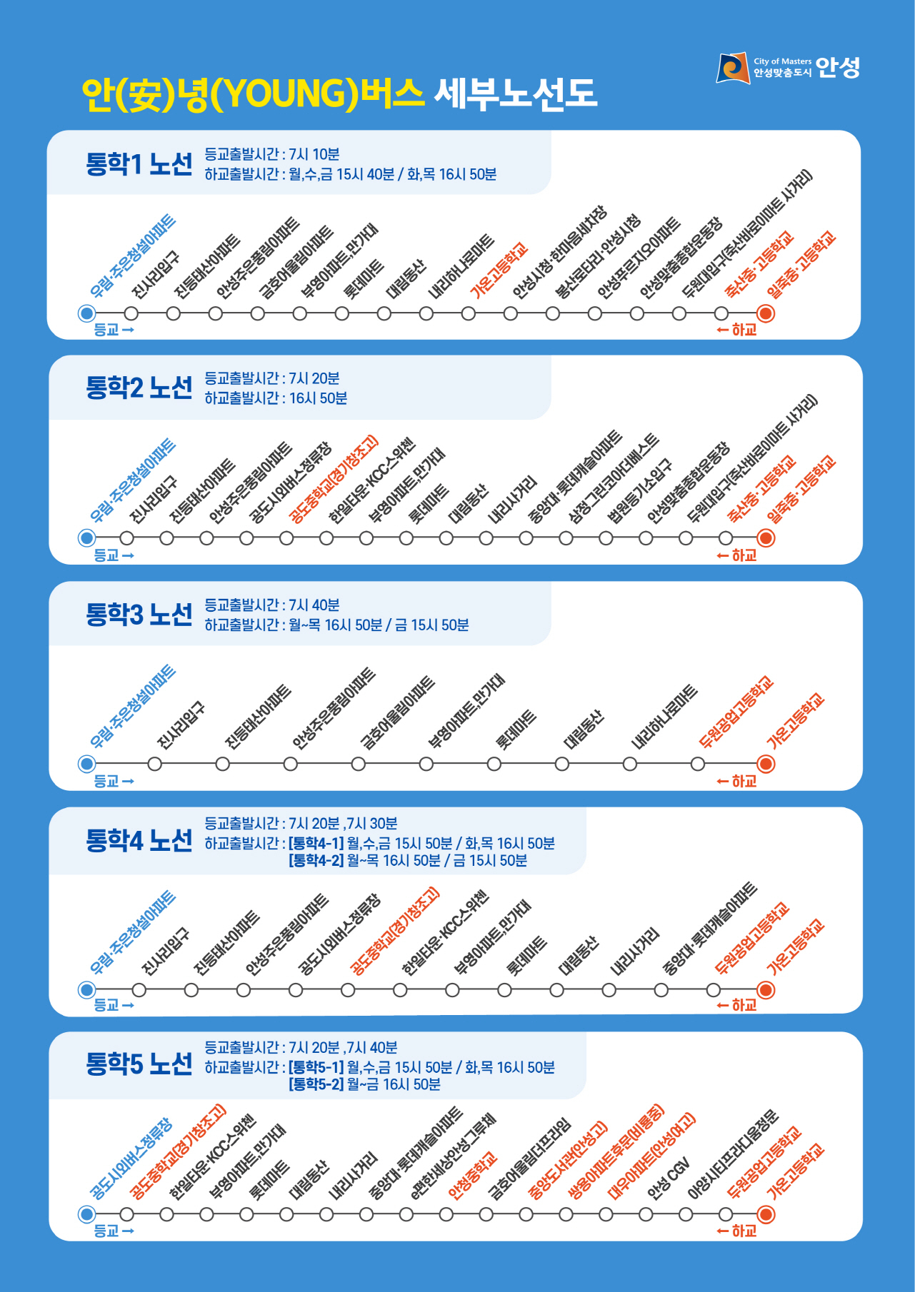 안성시와 경기도안성교육지원청이 공동으로 추진하는 협력 사업으로, 관내 대중교통 불편 지역 중·고등학생을 대상으로 운영된다. 총 5개 노선에 버스 7대를 투입해 13개 학교 학생들이 공동으로 이용할 수 있도록 했다.