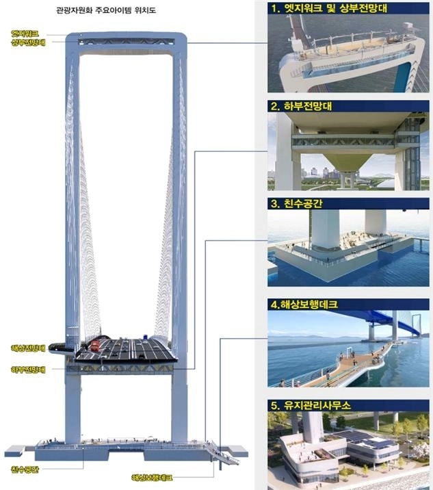 시는 또 교량 아래에는 하부 전망대와 친수공간, 대형 미디어아트, 바다 영화관, 바다 위를 걷는 해상 보행데크 등을 설치하고 무료로 개방한다.