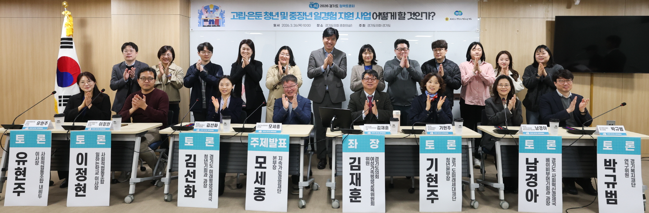 | 26일 경기도의회 중회의실에서 열린 ‘고립·은둔 청년 및 중장년 일경험 지원 어떻게 할 것인가?’ 주제 정책토론회에서 좌장을 맡은 김재훈 의원이 토론 참석자들과 기념촬영을 하고 있다.(사진=경기도의회) |
