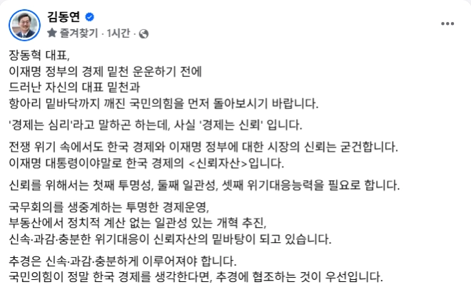 그러면서 “경제는 심리’라고 말하곤 하는데, 사실 ‘경제는 신뢰’”라며 “전쟁 위기 속에서도 한국 경제와 이재명 정부에 대한 시장의 신뢰는 굳건하다”고 강조했다.