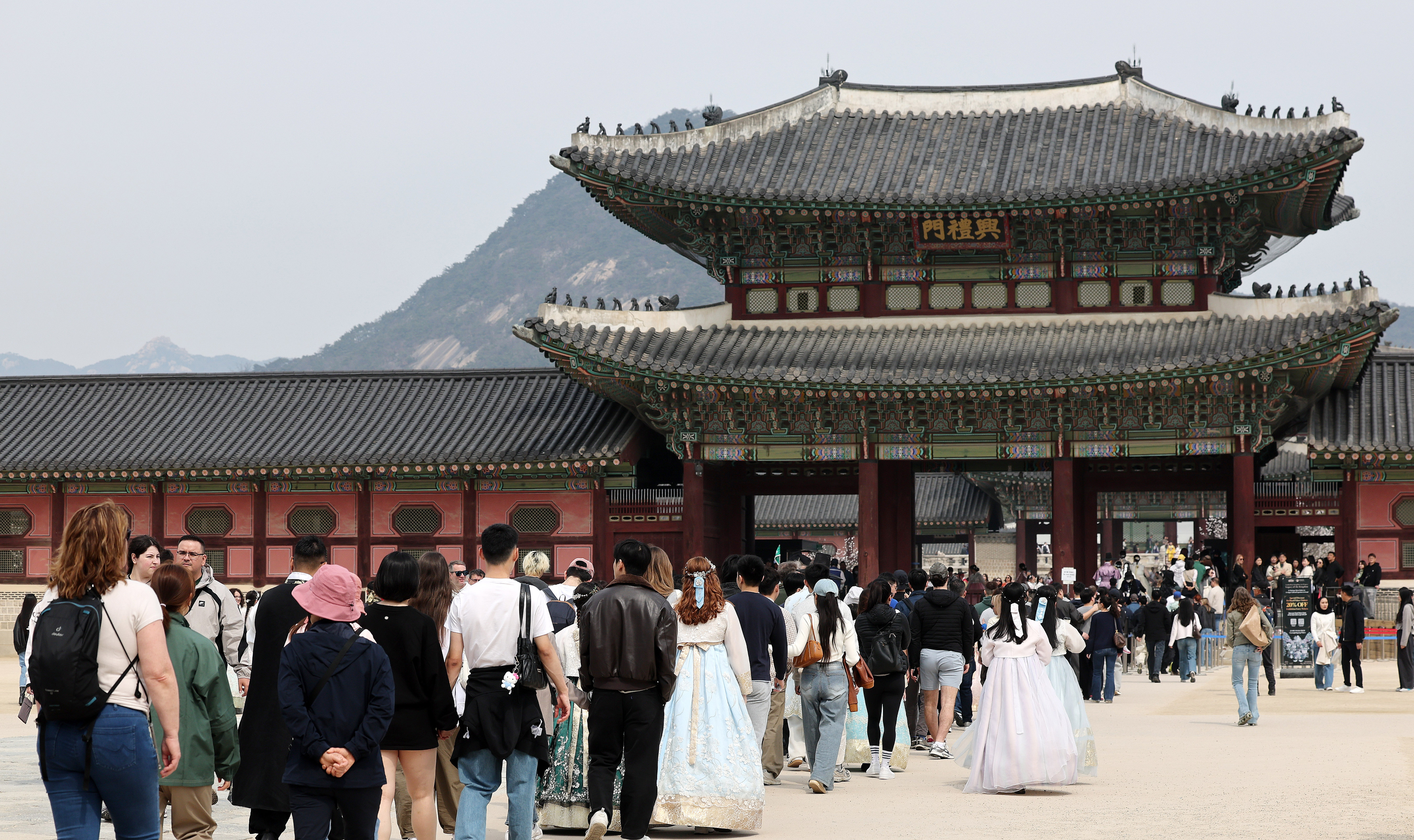 29일 낮 최고기온이 22도까지 오르는 완연한 봄 날씨 속에 서울 경복궁을 찾은 관광객들이 입장을 위해 기다리고 있다.