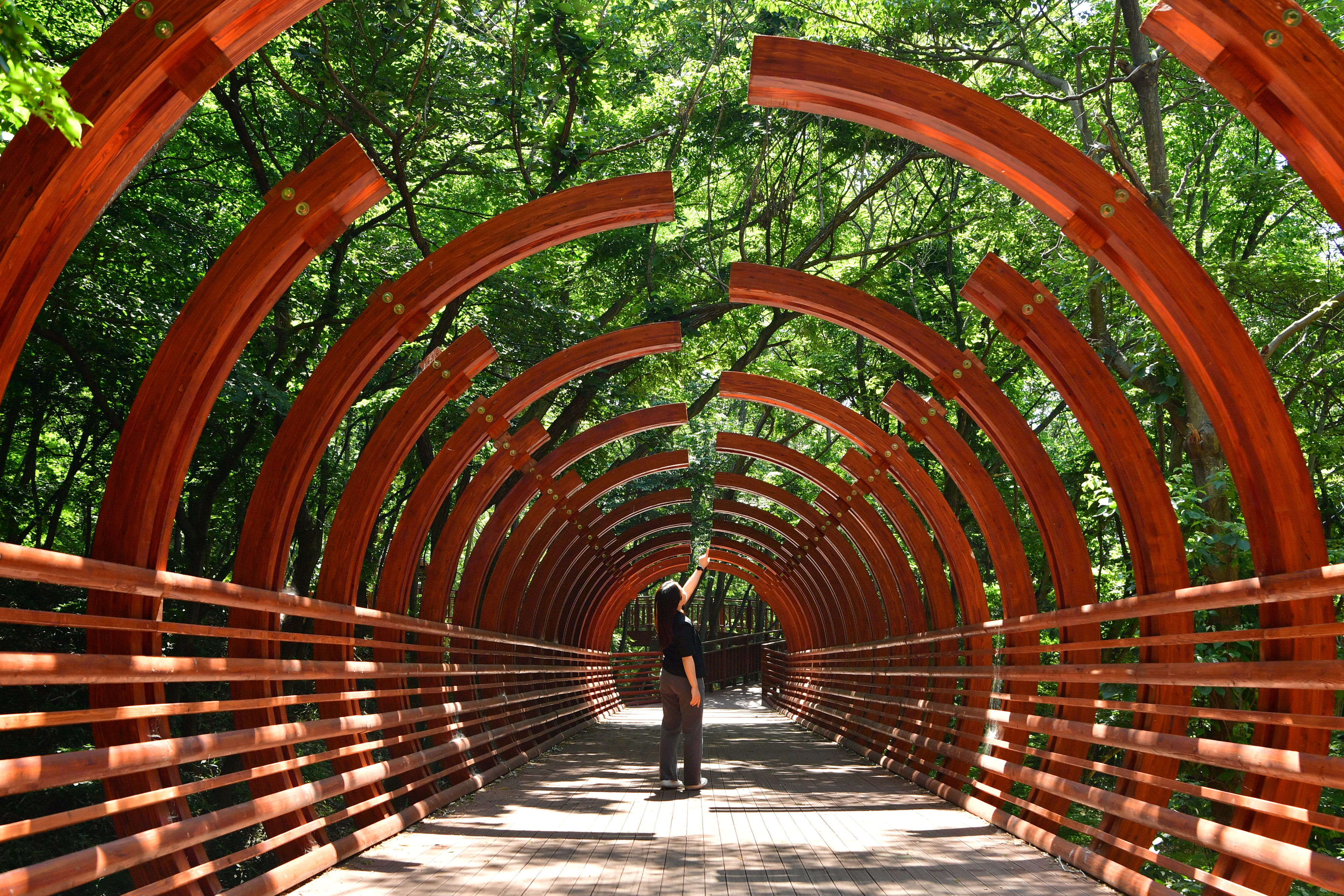하늘숲길은 관람 편의성과 색다른 관광 아이템을 갖춘 ‘무장애 목조 산책로’다. 경사가 완만하고 계단이 없어 노약자나 어린이도 부담 없이 걸을 수 있다. 일부 구간은 지상으로부터 최대 10m 높이에 설치돼 있어 걷는 동안 숲의 웅장한 전경을 감상할 수 있다.