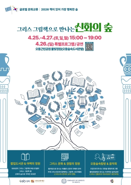 오동근린공원 물빛정원에서 열리는 이번 행사는 행사장 전체를 ‘그리스 그림책으로 만나는 신화의 숲’을 주제로 조성한다. 행사장에는 500여권의 도서를 갖춘 ‘팝업도서관’, 숲속에서 감상하는 ‘그리스 그림책’ 전시, 신화 속 장면을 재현한 ‘포토존’이 운영된다. ‘그리스 알파벳 스탬프 체험’ 등도 진행해 어린이들이 고대 그리스 문화를 친숙하게 접할 기회도 제공한다.