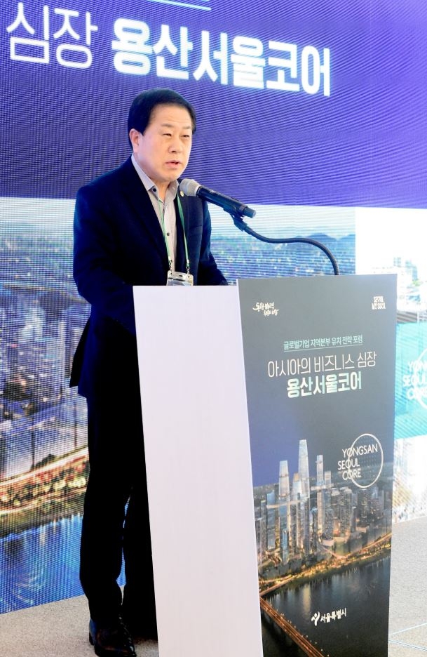 | 지난 27일 용산구 전쟁기념관 피스앤파크 컨벤션에서 개최된 ‘아시아의 비즈니스 심장, 용산서울코어: 글로벌기업 지역본부 유치 전략 전문가 포럼’에 참석한 김용호 서울시의원이 축사하고 있다. |